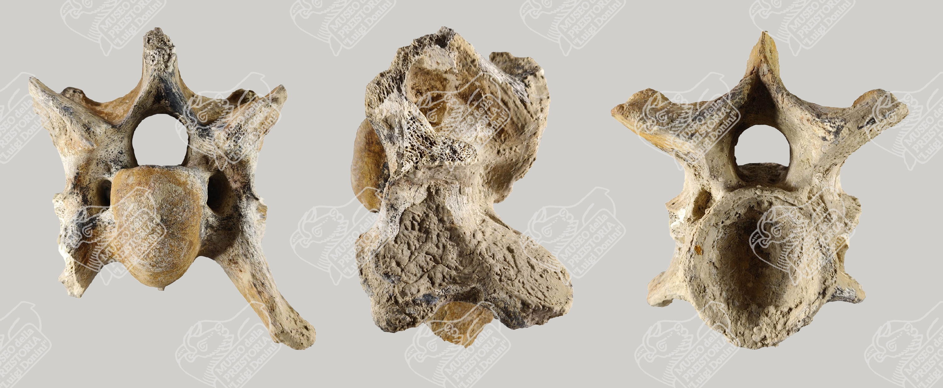 Vertebra cervicale di Bisonte delle steppe in norma craniale (sinistra), in norma laterale (centrale) e in norma caudale (destra)
