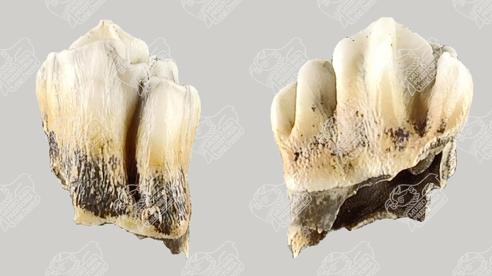 Premolare di Megacero in norma laterale (sinistra) e linguale (destra)