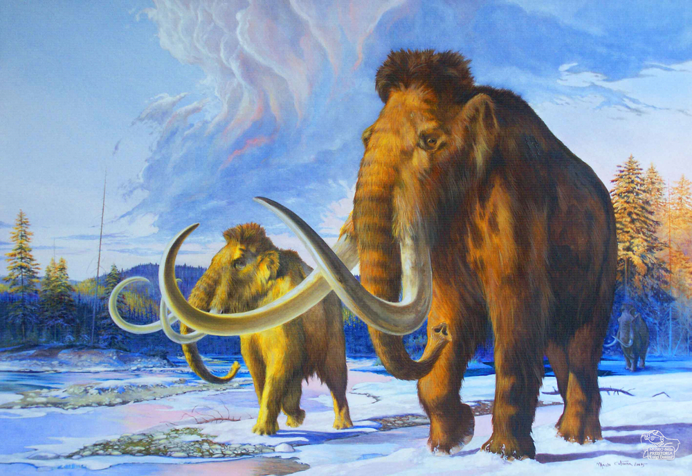 Raffigurazione pittorica di una mandria di mammut in un paesaggio innevato all'alba