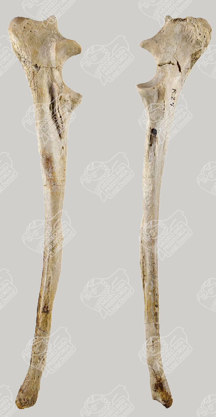 Ulna destra di Lupo in norma laterale (sinistra) e in norma mediale (destra)
