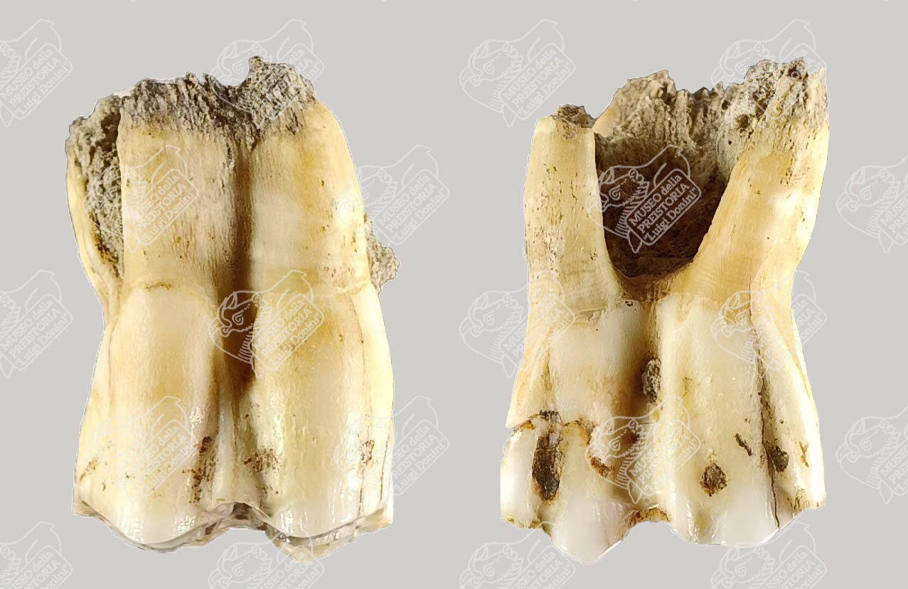 Molare superiore di Bisonte delle steppe in norma guanciale (sinistra) e linguale (destra)