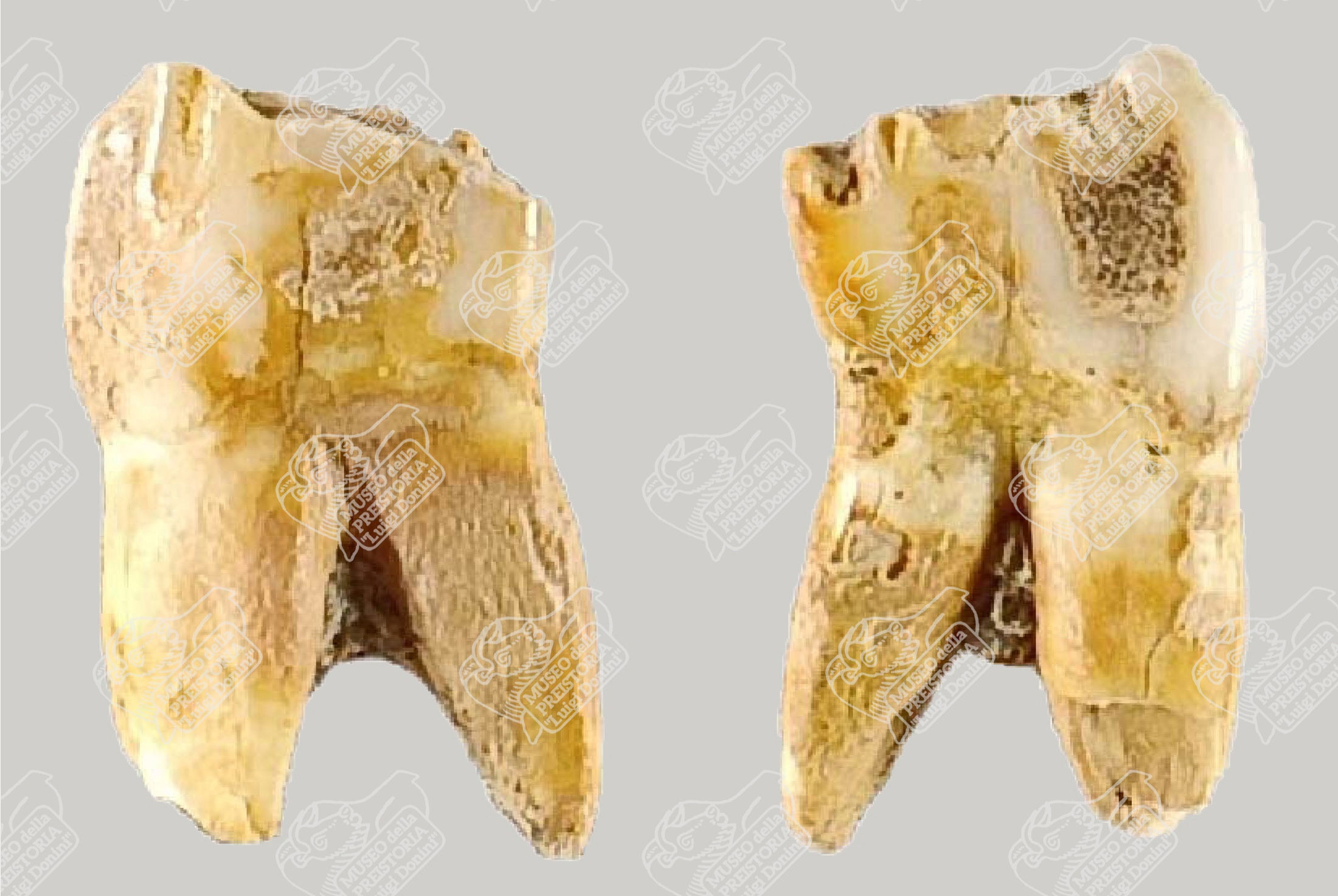 Premolare inferiore di Megacero in norma guanciale (sinistra) e linguale (destra)