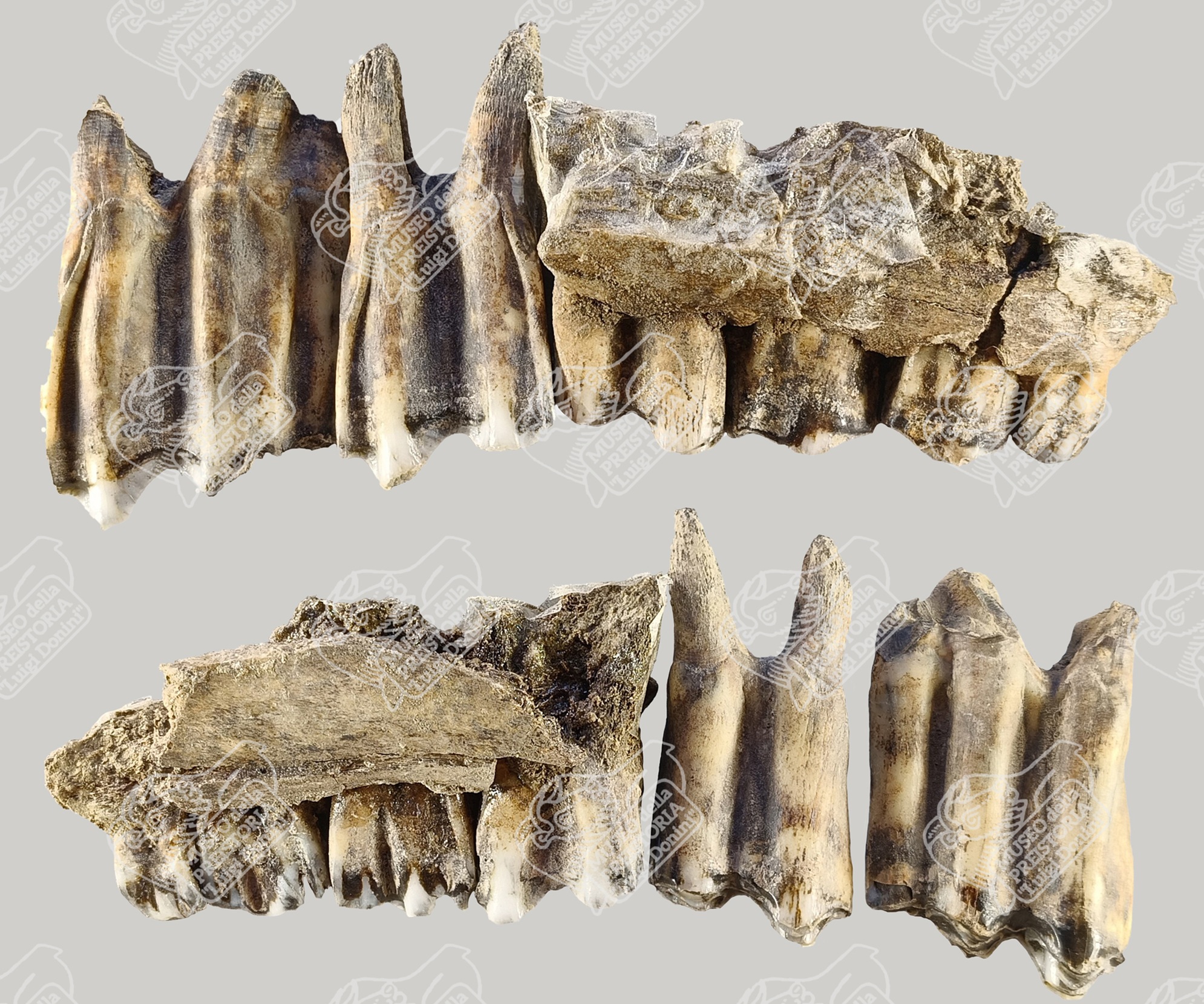 Frammento di mascellare di Bisonte delle steppe in norma guanciale (sopra) e in norma linguale (sotto)