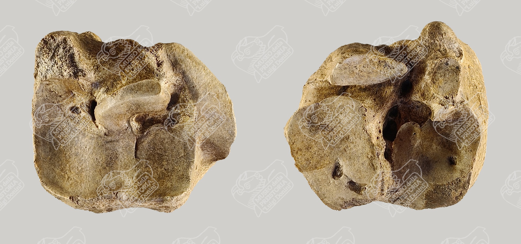 Tarsale centrale di Bisonte delle steppe in norma dorsale (sinistra) e in norma palmare (destra)