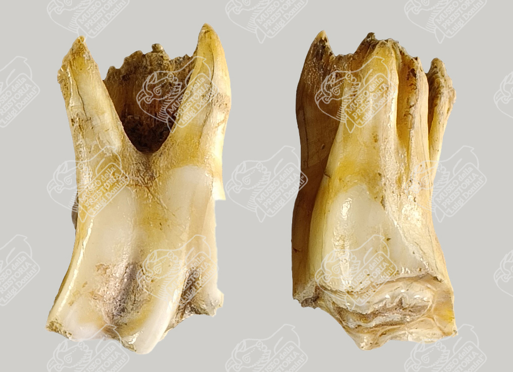 Premolare di Bisonte delle steppe in norma guanciale e linguale