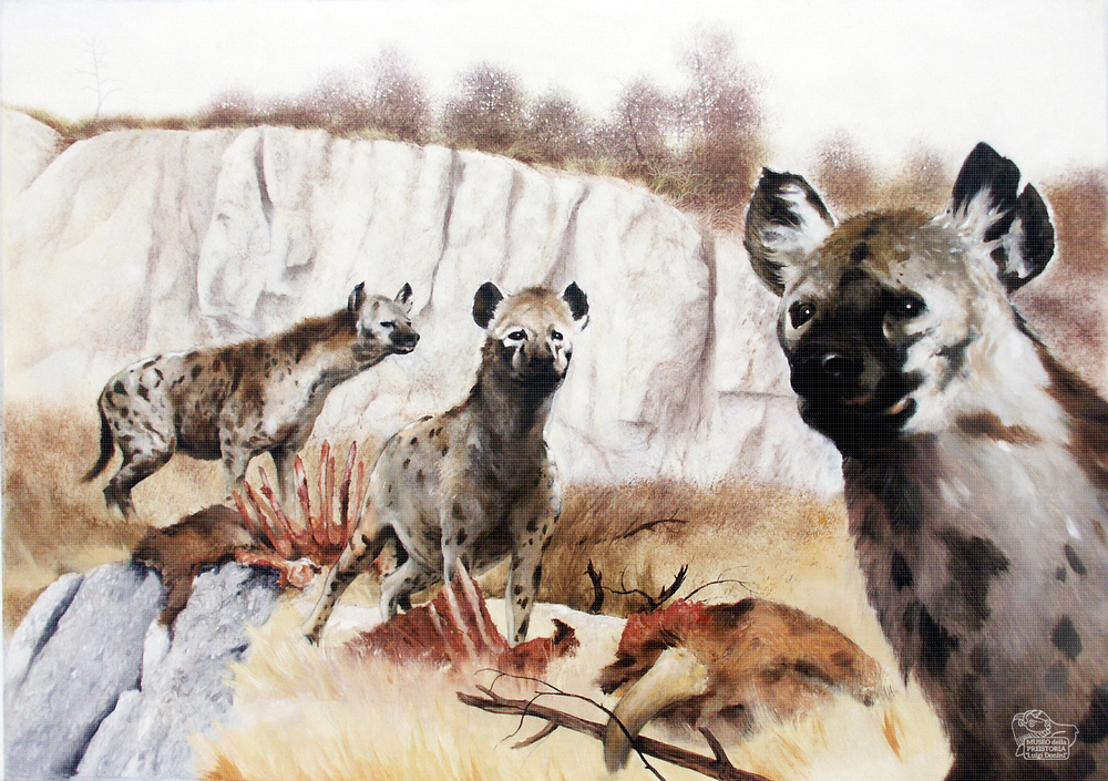 Raffigurazione di un gruppo di iene delle caverne che si apprestano a divorare delle carcasse