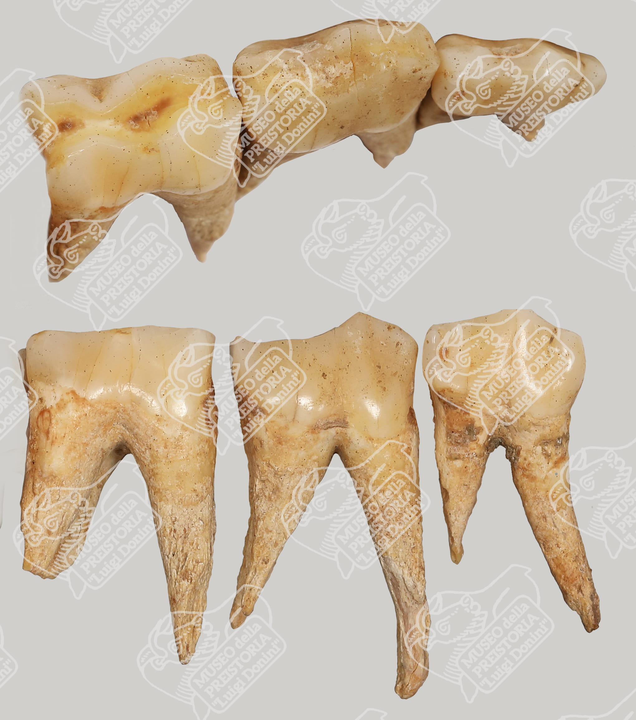 Premolari inferiori sinistri di Cinghiale in norma linguale (sotto) e in norma occlusale (sopra)