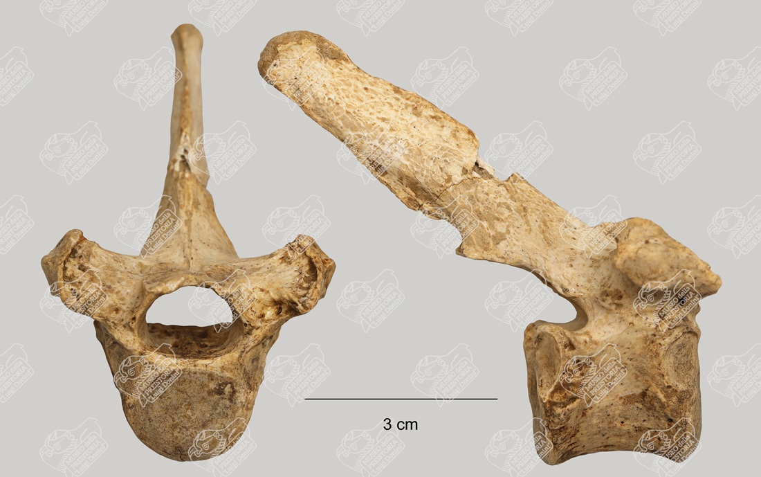 Vertebra toracica di Lupo in norma craniale (sinistra) e laterale (destra)