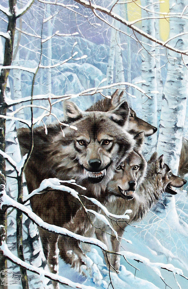 Particolare della raffigurazione pittorica di un branco di lupi in un paesaggio innevato