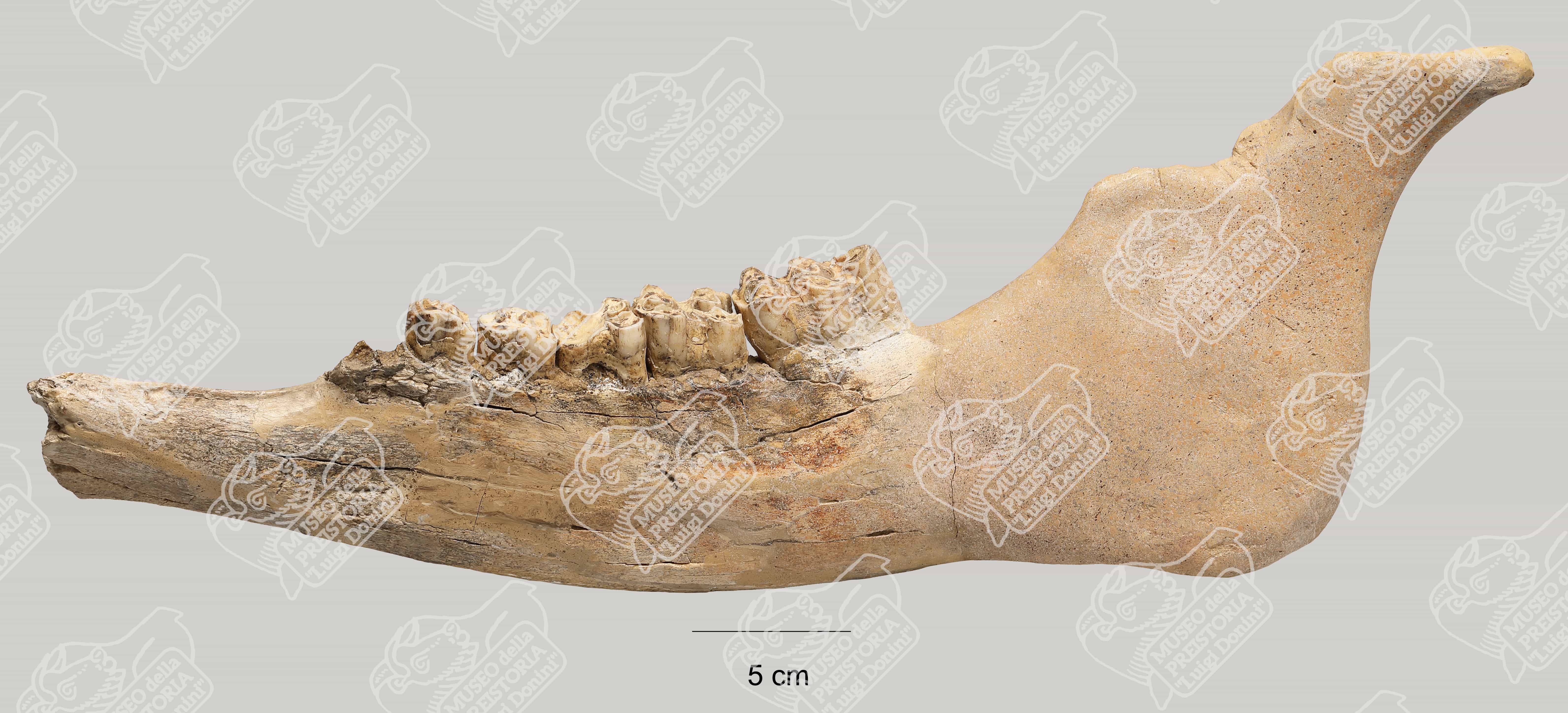 Emimandibola sinistra di Bisonte delle steppe in norma guanciale