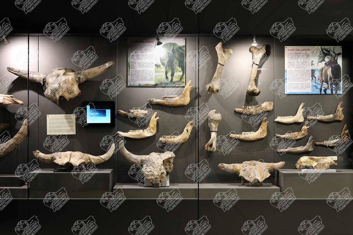 Vetrina contenente ossa di Bisonte delle steppe (a sinistra e al centro) ed ossa di Megacero (a destra) provenienti dall'ex giacimento fossilifero della Cava a Filo