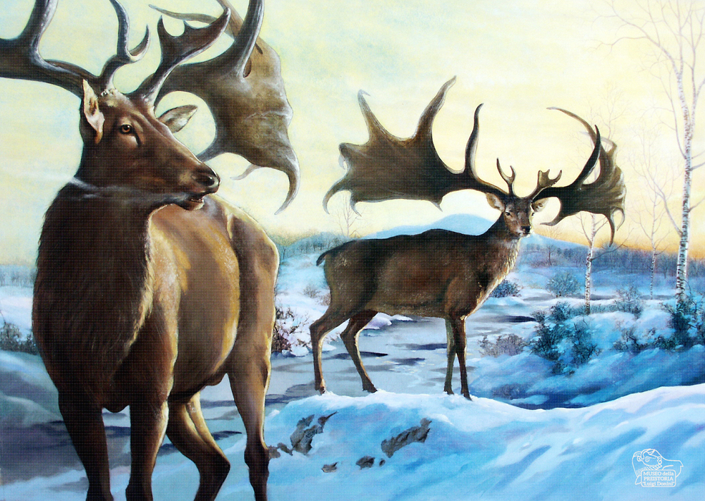 Raffigurazione pittorica di due megaceri in un paesaggio innevato