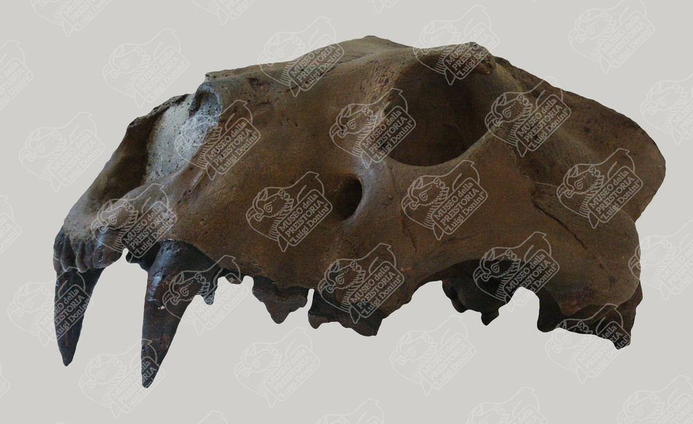 Calco di cranio di leone delle caverne in norma latero-nasale