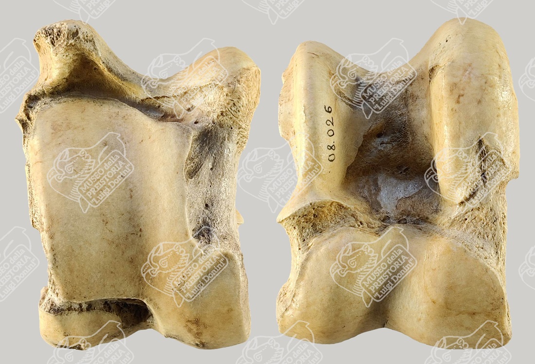 Astragalo di Bisonte delle steppe in norma dorsale (sinistra) e palmare (destra)